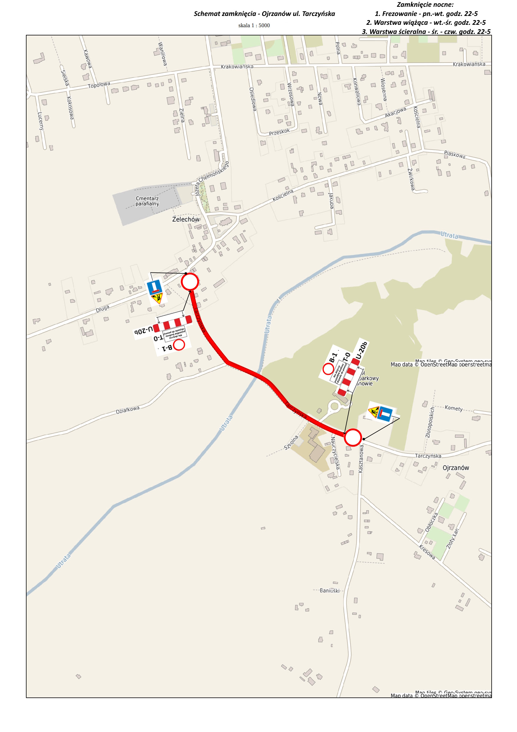 Powiatowy Zarząd Dróg w Grodzisku Mazowieckim informuje, że w dniach od 17.11.2025r. do 20.11.2025r., wprowadzone zostanie całkowite zamknięcie (nocne) odcinka ul. Tarczyńskiej w m. Ojrzanów i Żelechów (na odcinku od ul. Kasztanowej do rejonu skrzyżowania z ulicą Długą i Chełmońskiego).